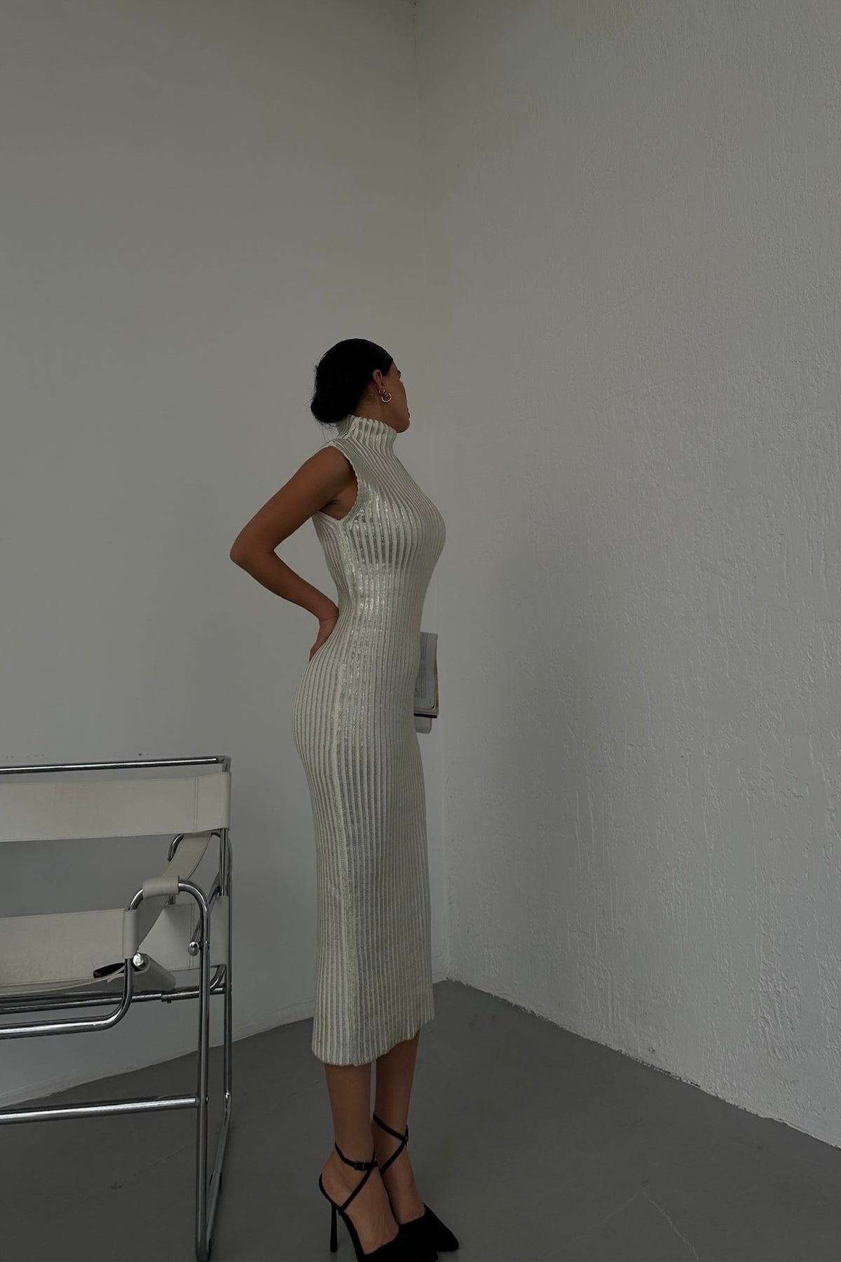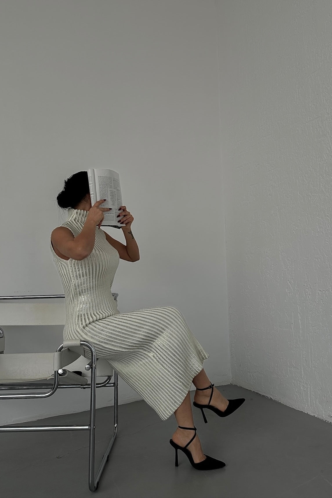 - Ribbed texture throughout, enhancing the vertical lines and elongating the silhouette.