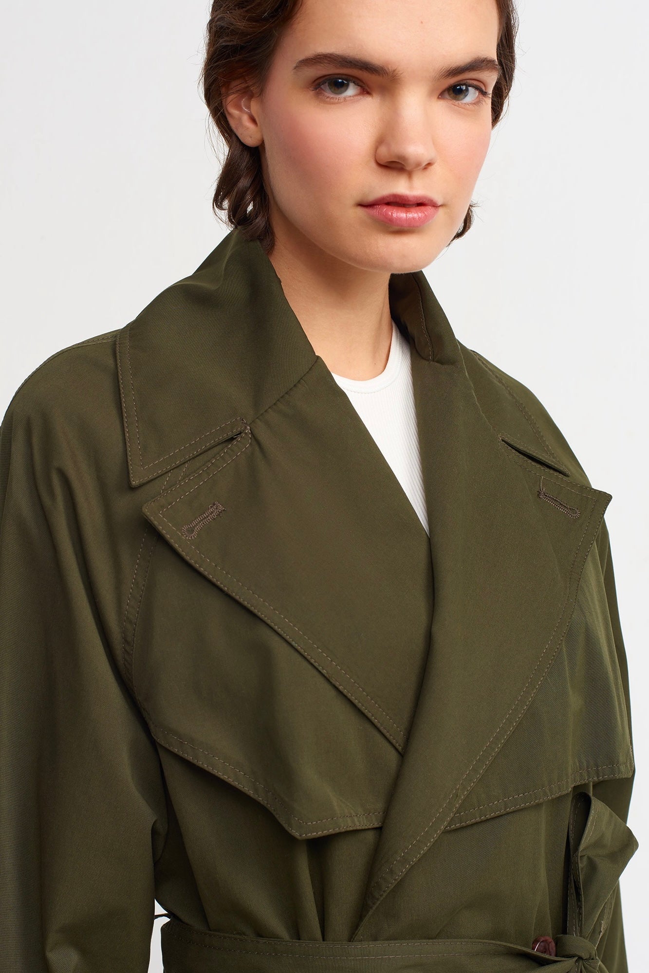 Faux Leather Detailed Herringbone Wool Trench Coat