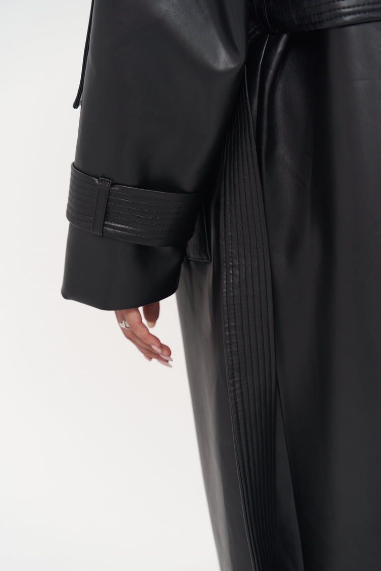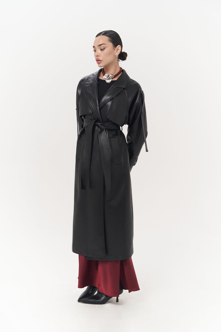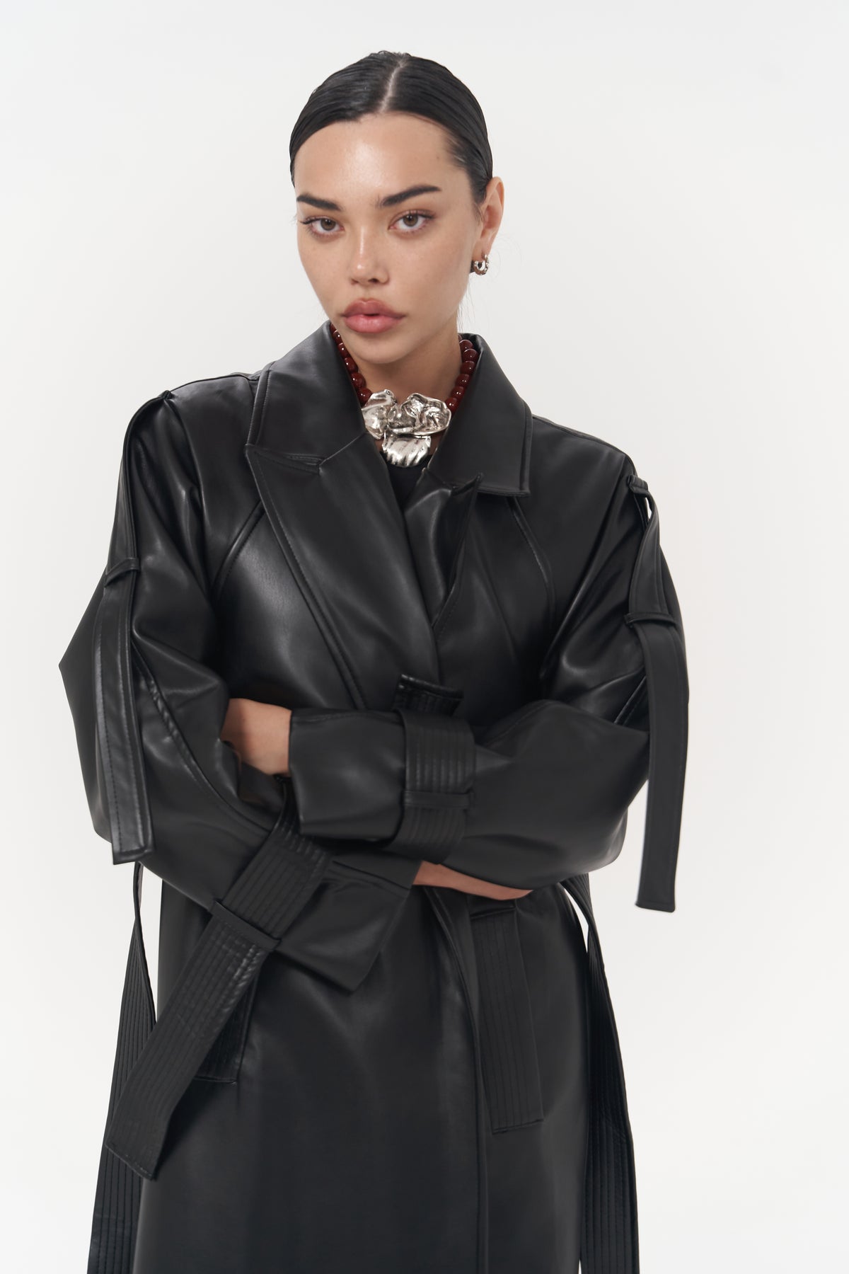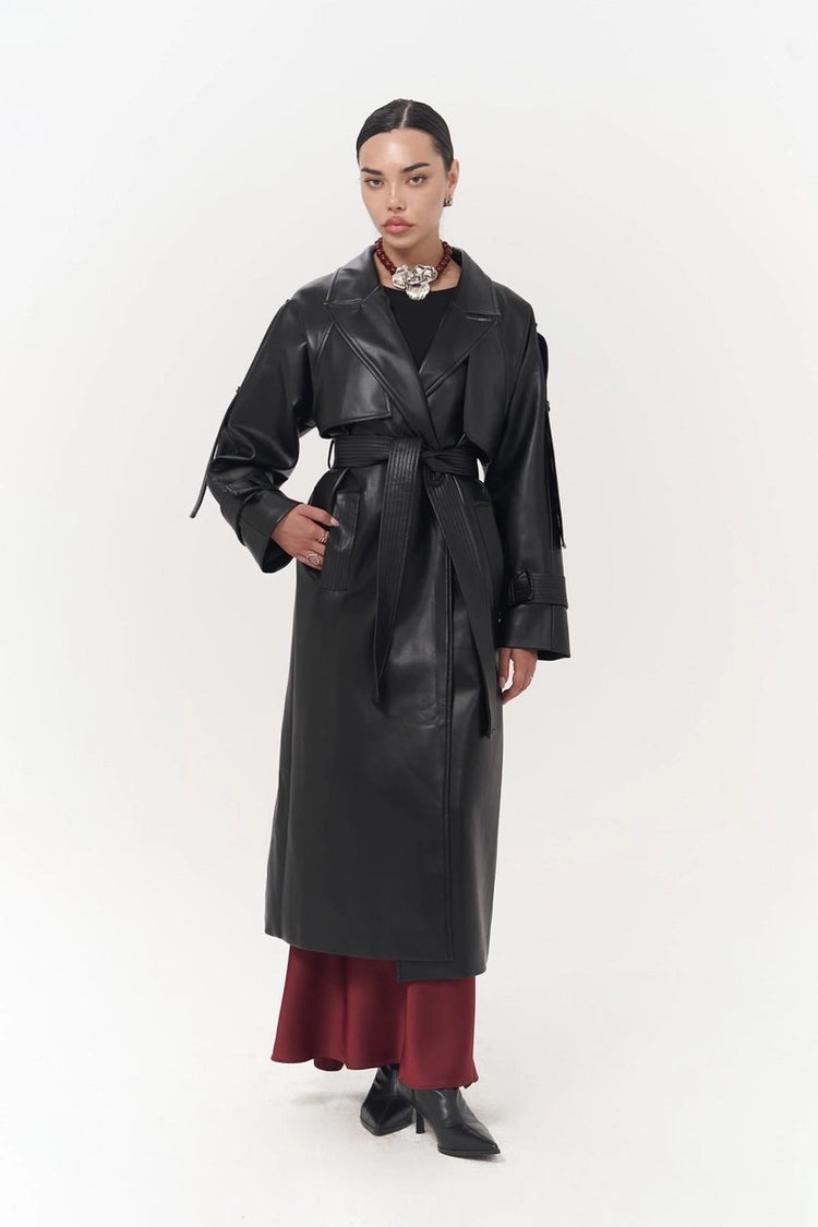 Faux Leather Detailed Herringbone Wool Trench Coat