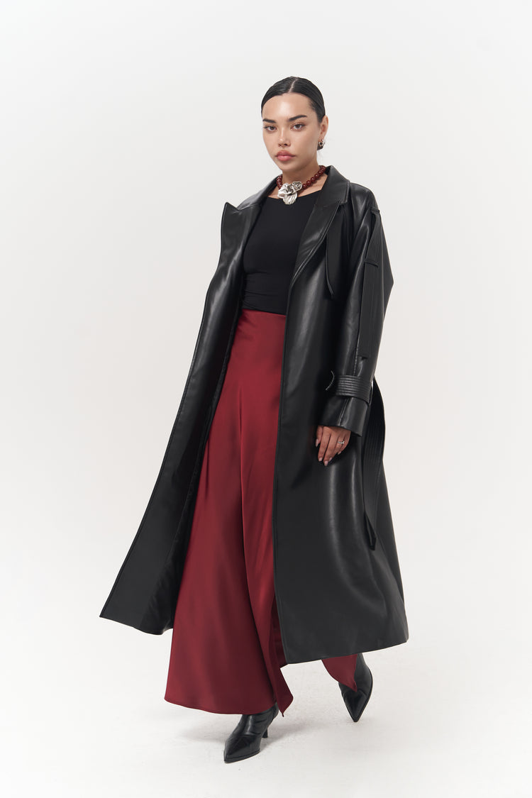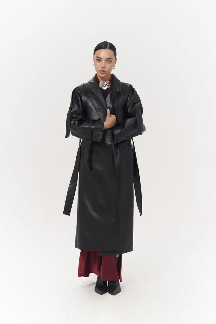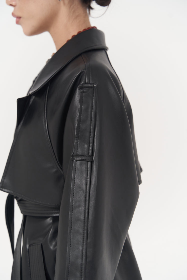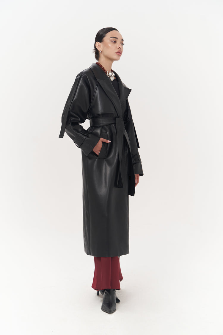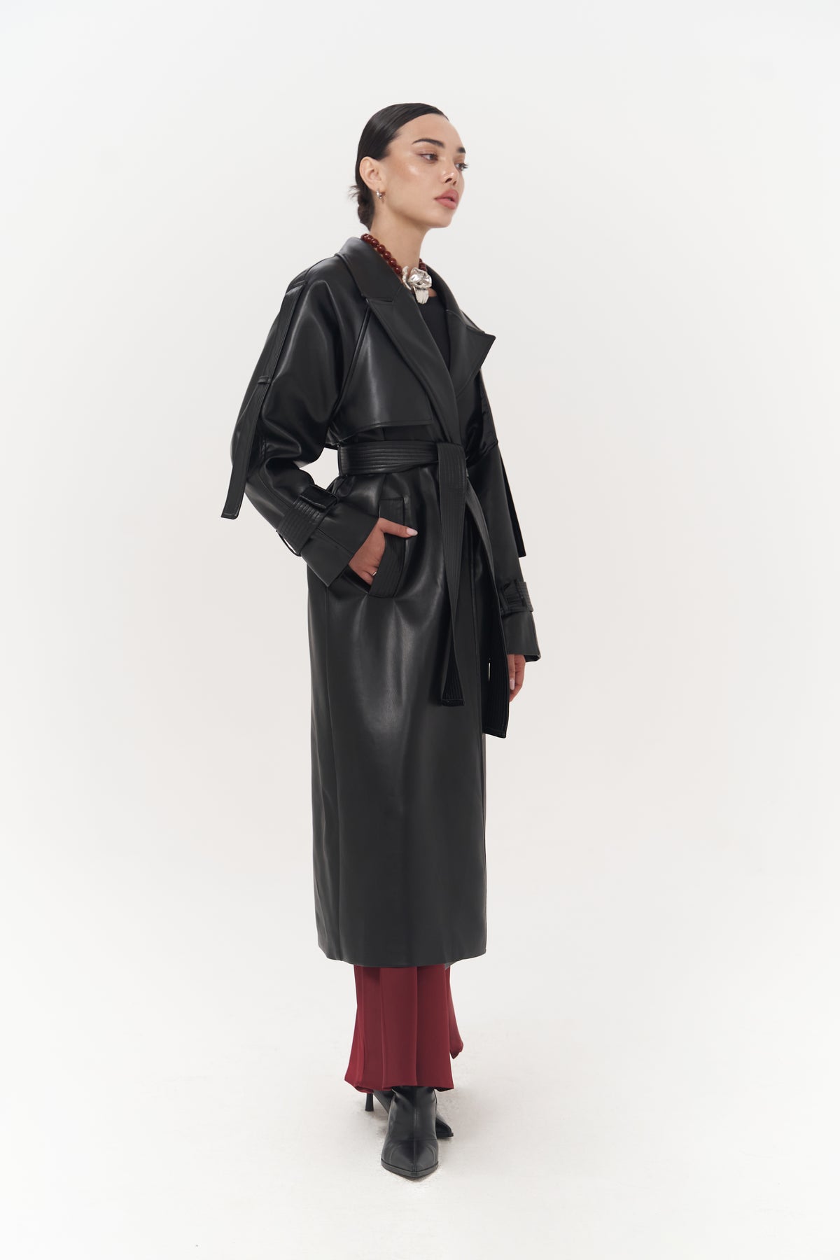 Faux Leather Detailed Herringbone Wool Trench Coat