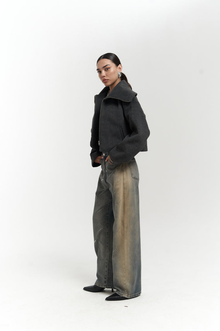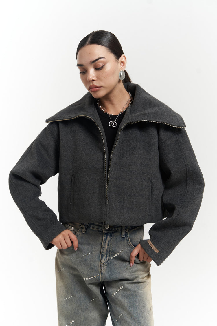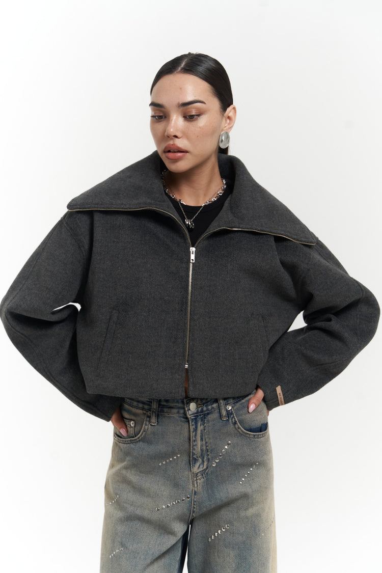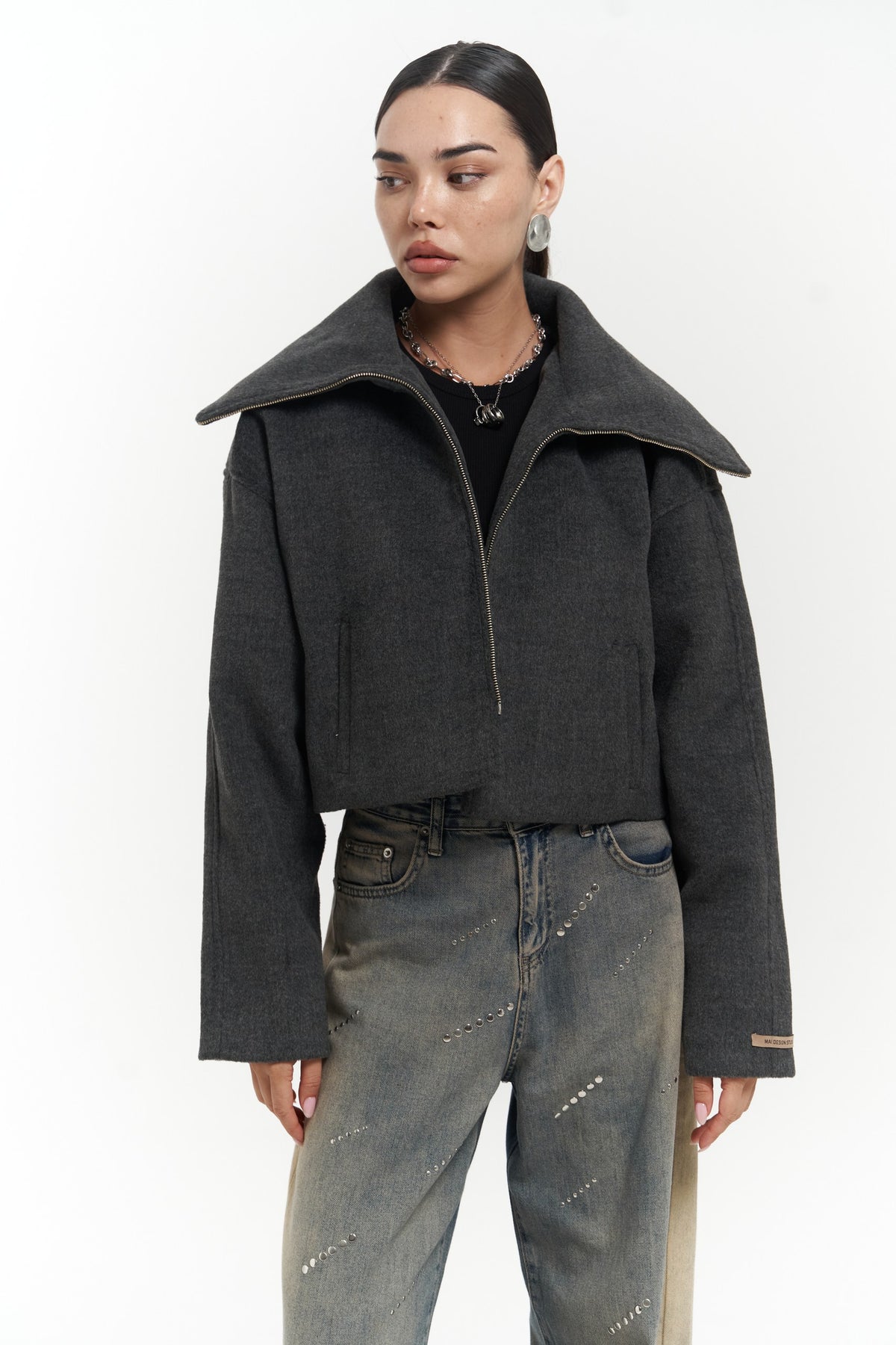 Oversized Funnel Collar Zip-Up Cropped Jacket