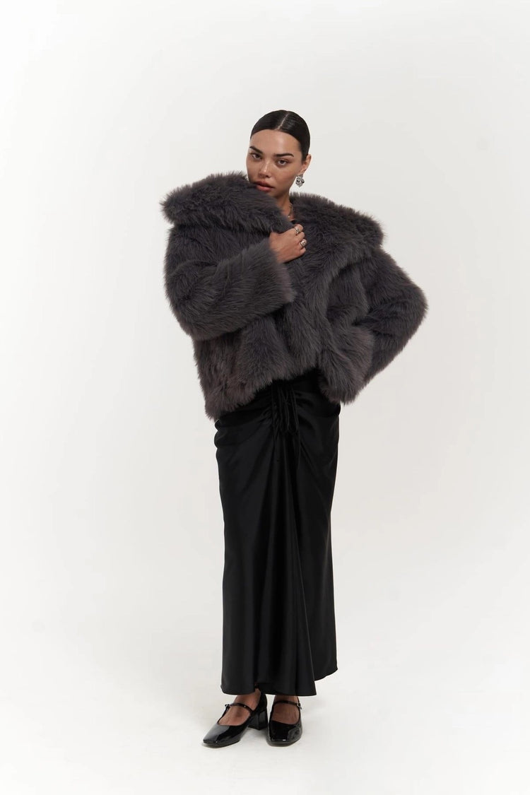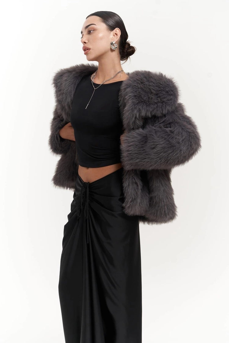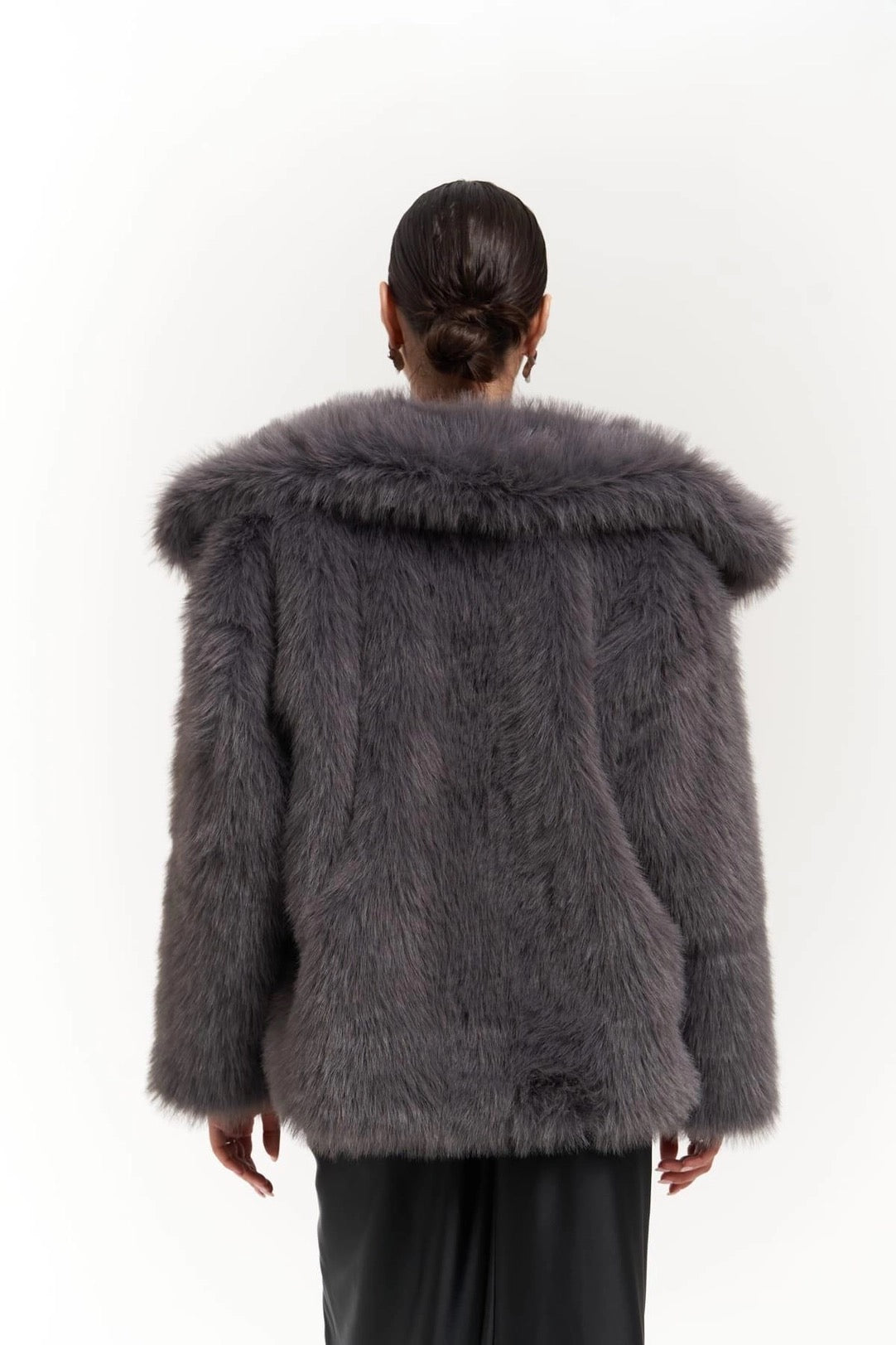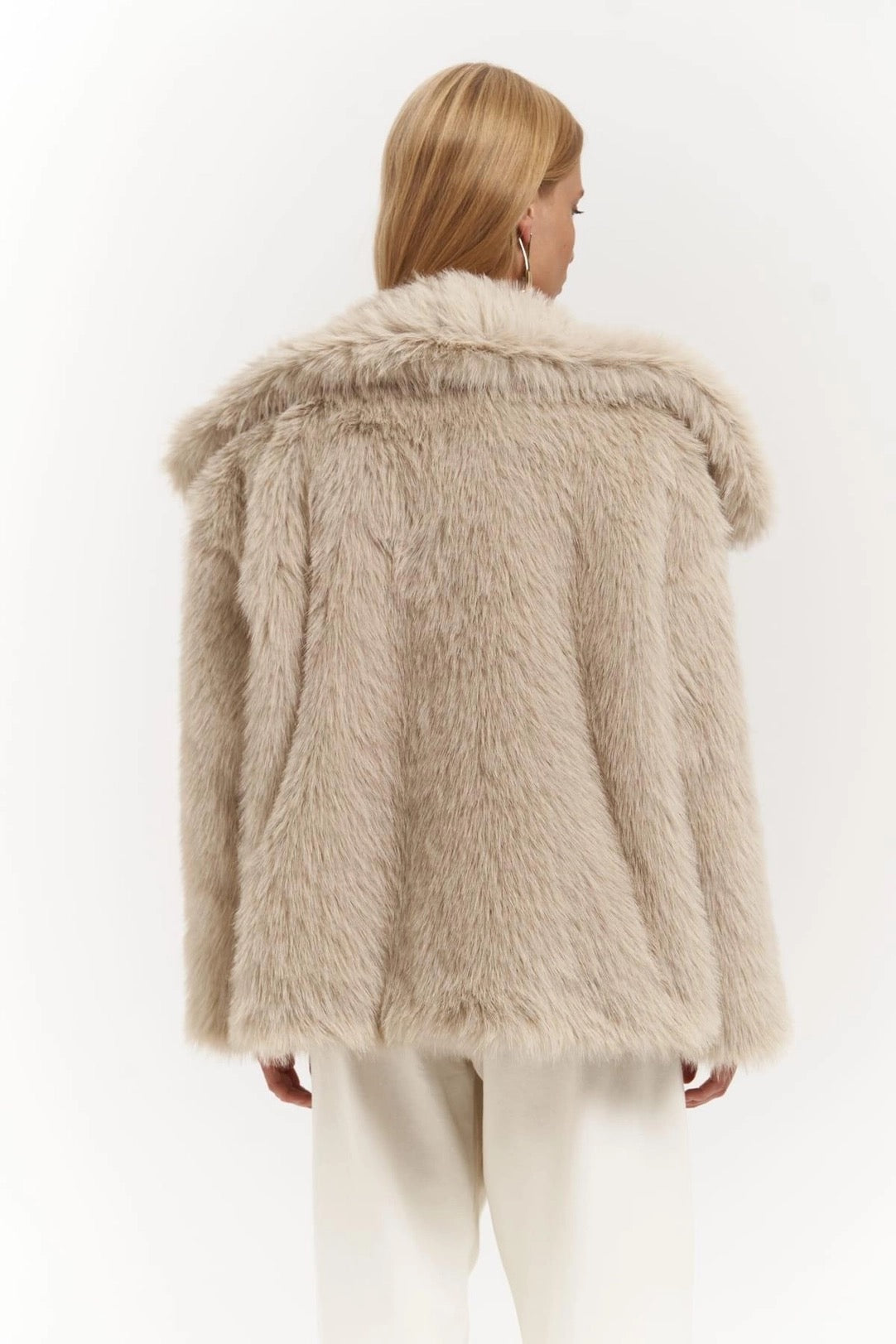 - This cozy fur jacket is crafted from 100% polyester, with a fluffy, textured fabric for added warmth and style.