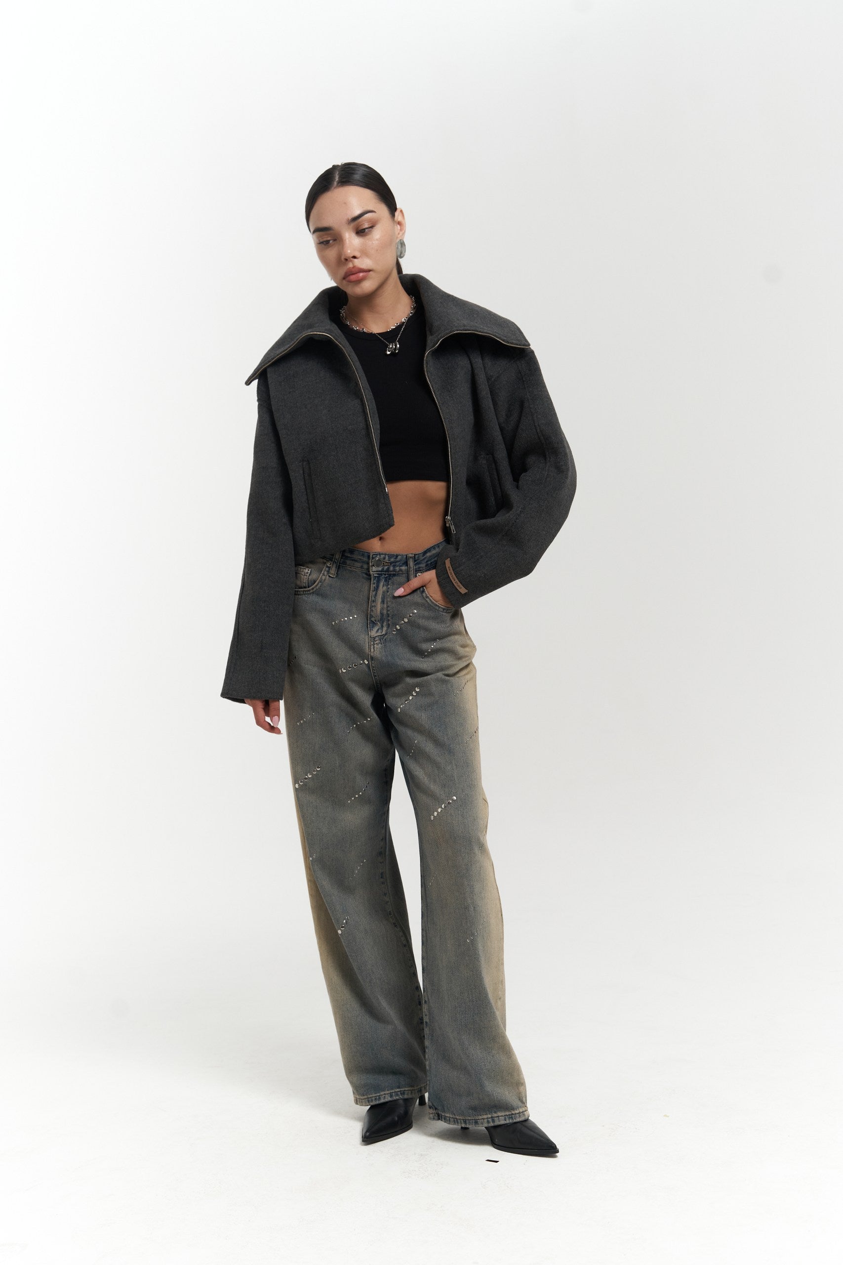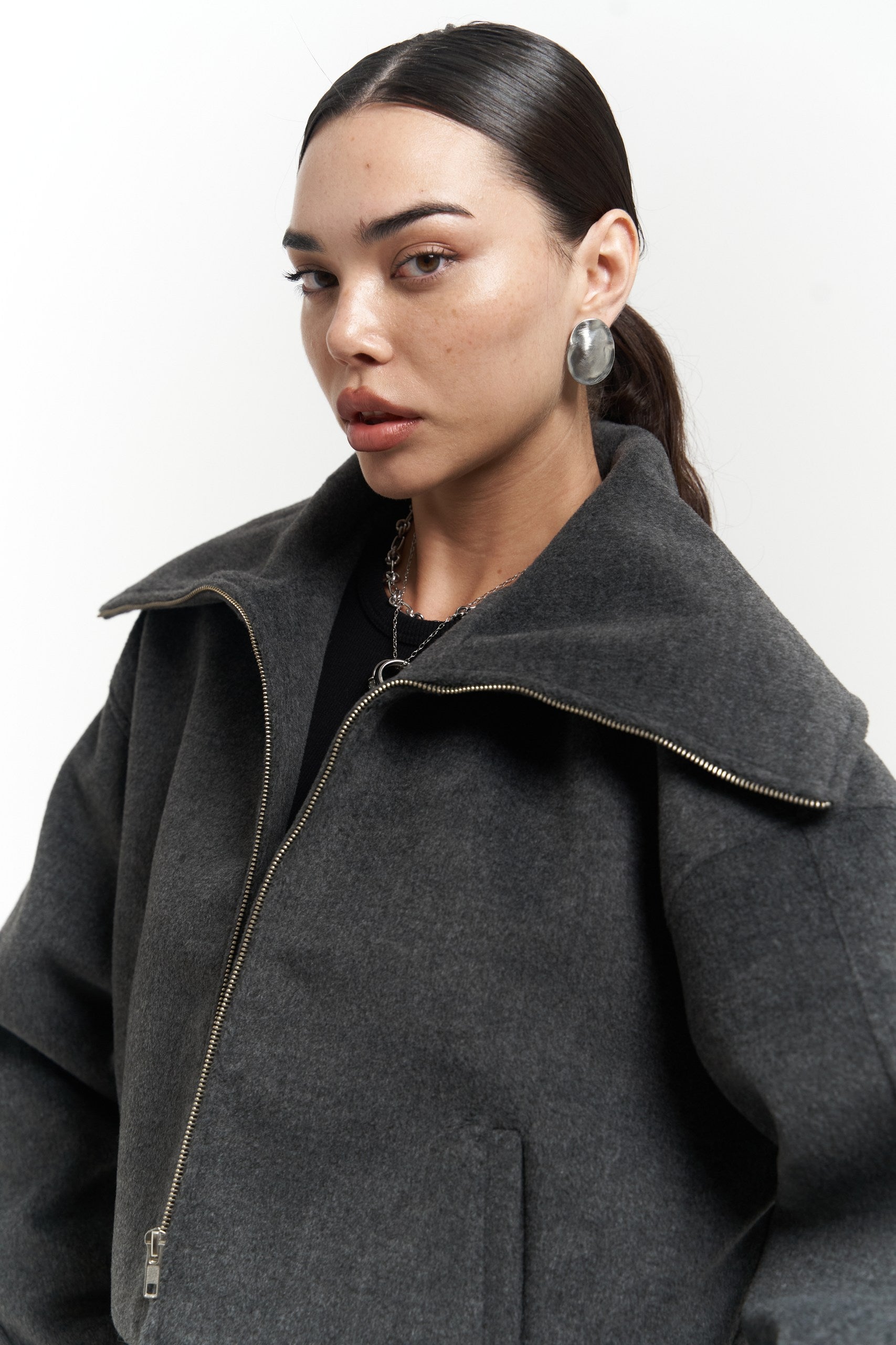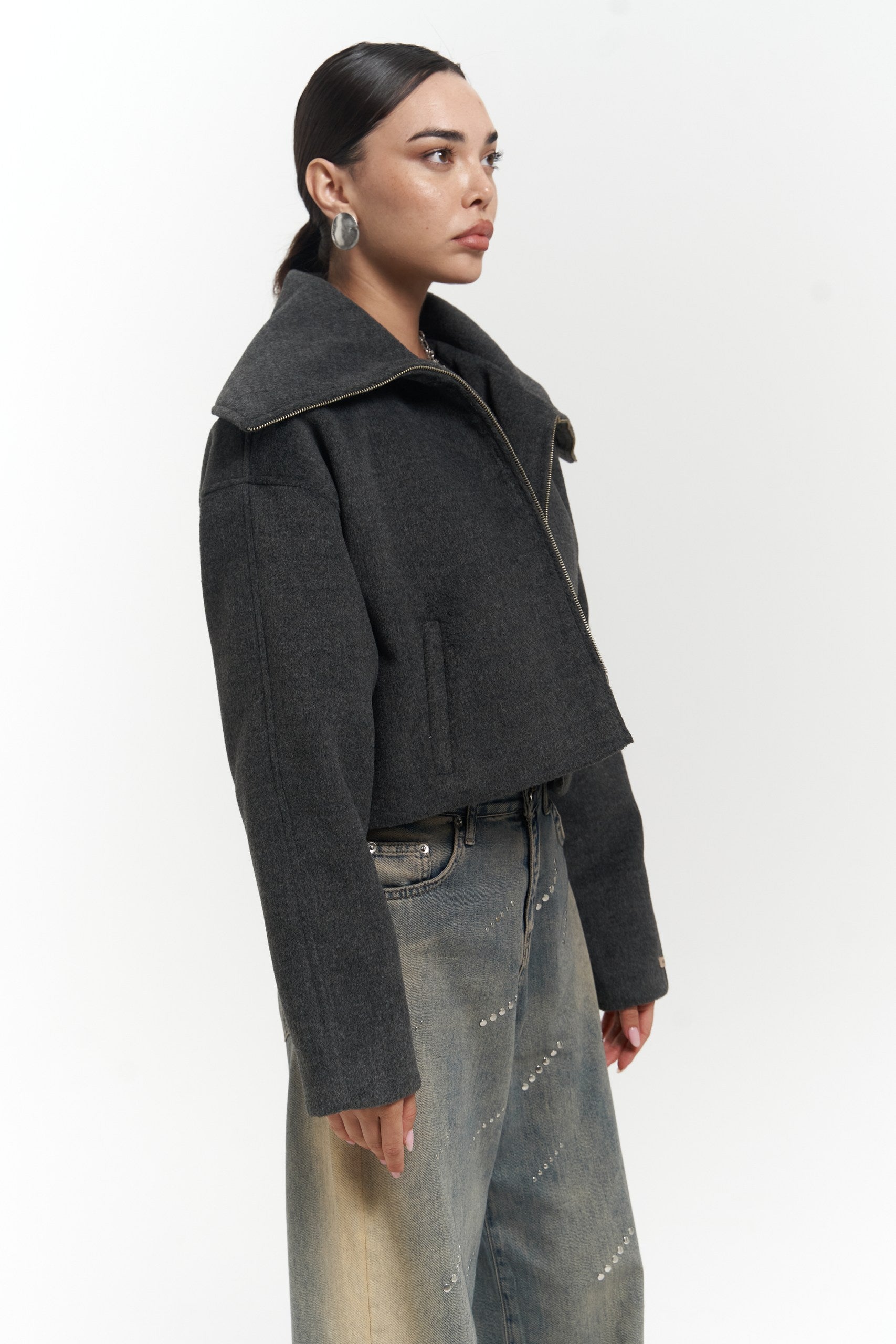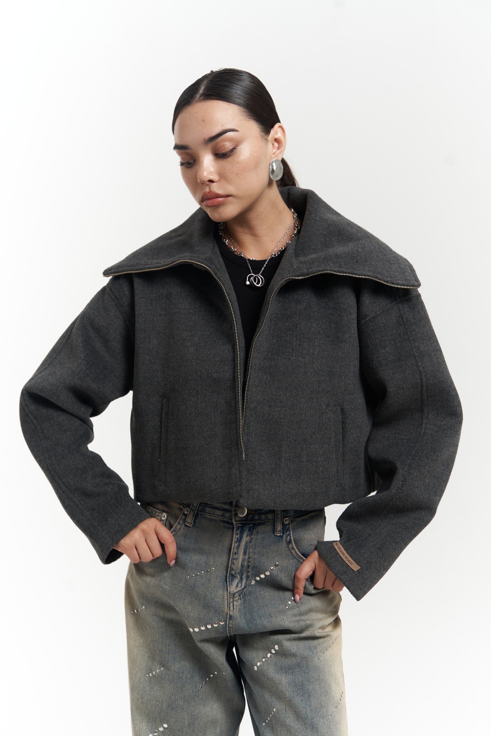 Oversized Funnel Collar Zip-Up Cropped Jacket