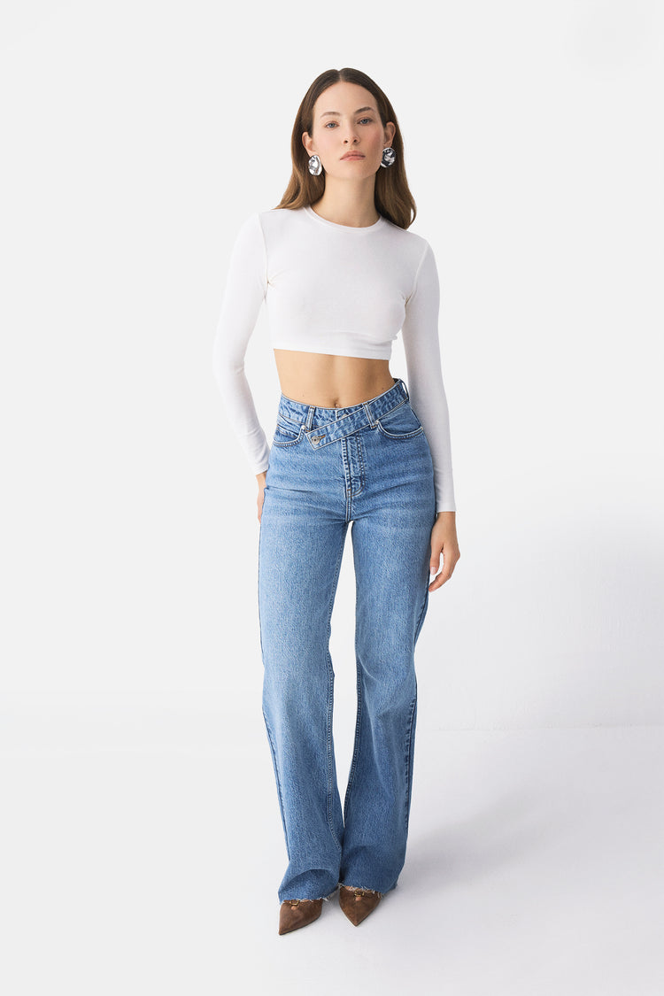 A high-waisted wide-leg pant designed with a clean drape and a cross-belt front for a modern, structured finish.