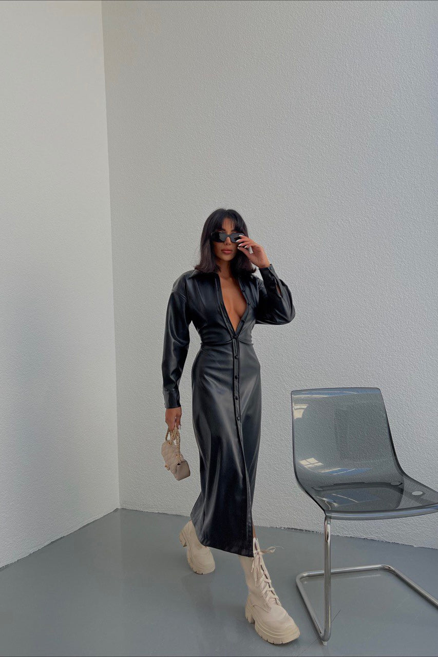 Front Slit Faux Leather Dress