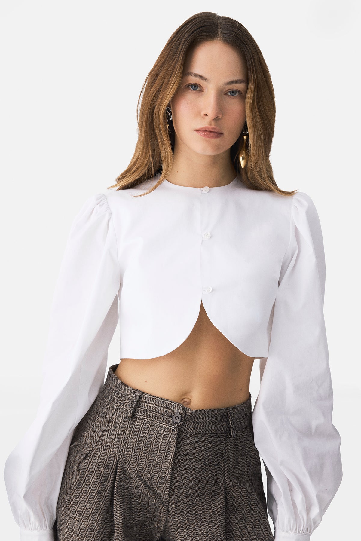 Tailored cropped blouse featuring sculpted edges and a precise, architectural cut. Crafted from crisp cotton poplin with voluminous sleeves and a contoured hem that frames the waistline.