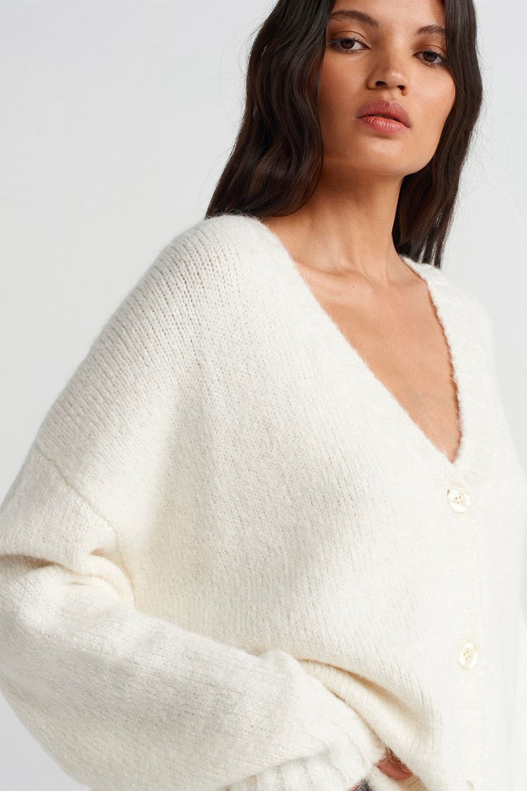 Relaxed, soft-touch knit cardigan with a deep V neckline and button front. One size only for an effortless oversized fit.