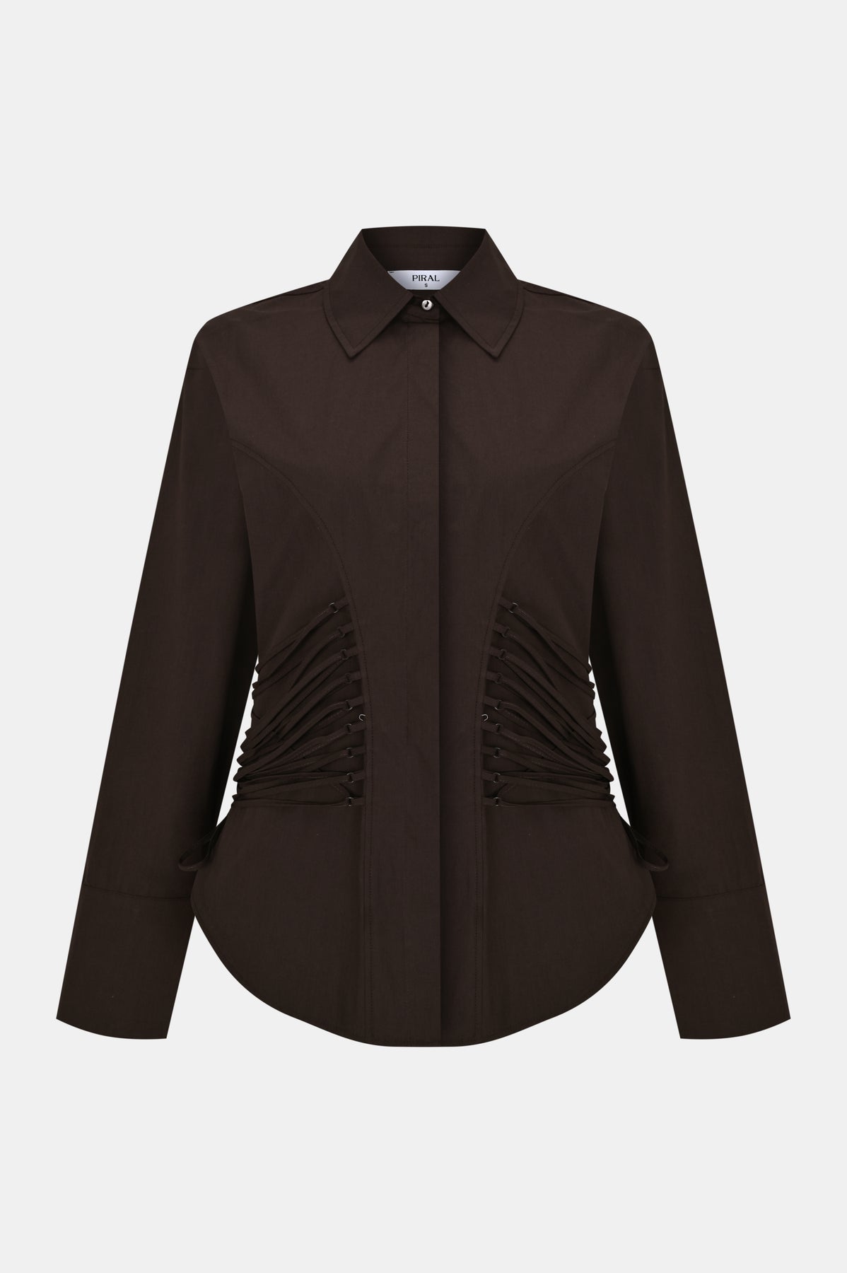 A sculpted take on the classic white shirt. The Corset Poplin Shirt is crafted from 100% cotton with adjustable corset-style ties at the waist, designed to contour and define the silhouette. Features a sharp collar, structured cuffs, and a curved hemline. A modern balance between tailoring and ease — wear it with denim or leather for a clean contrast.