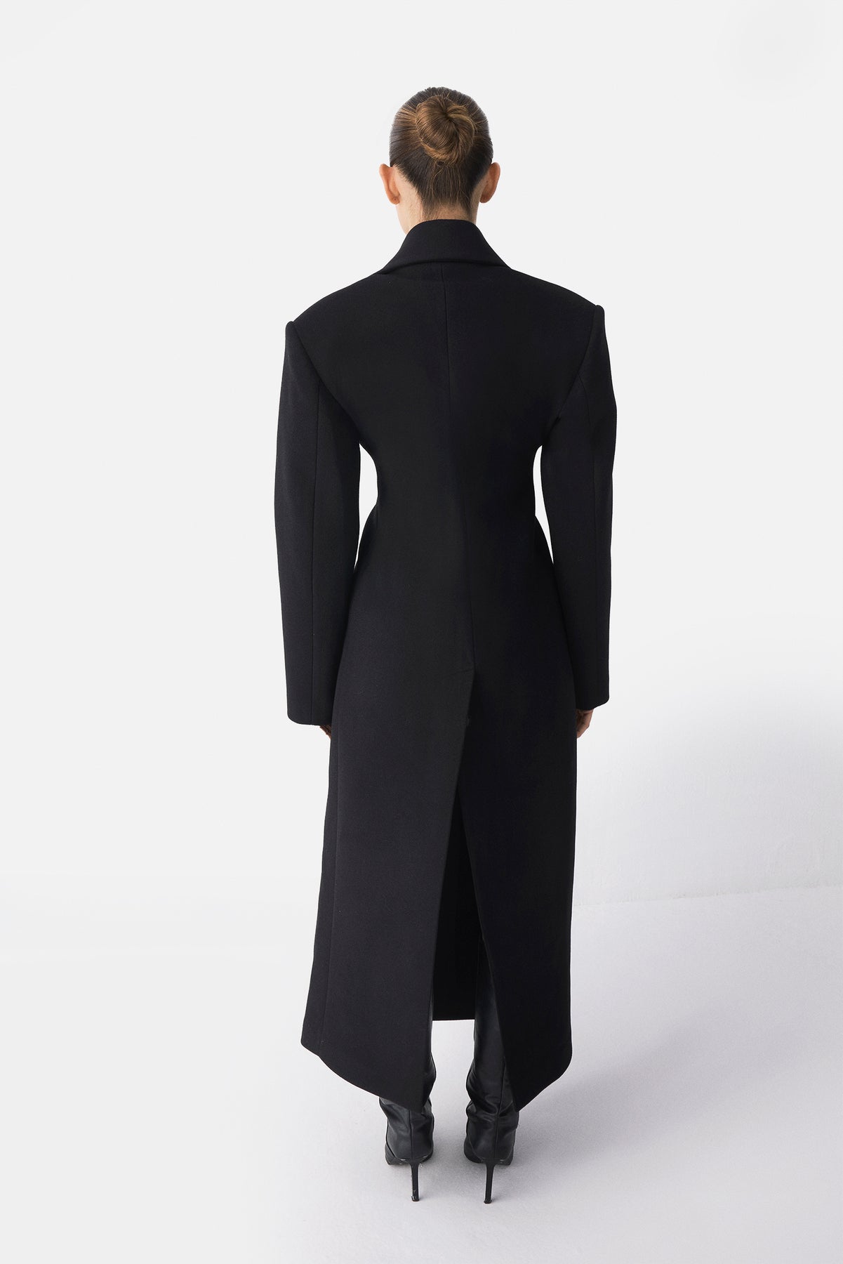 A sharply tailored long coat that defines structure and sophistication. Crafted from a premium wool–cotton blend with subtle texture, The Noir Contour Coat features a fitted silhouette that tapers through the waist, adjustable front buttons for a customizable shape, and a back slit that enhances movement and flow. A statement piece that balances strength and elegance.