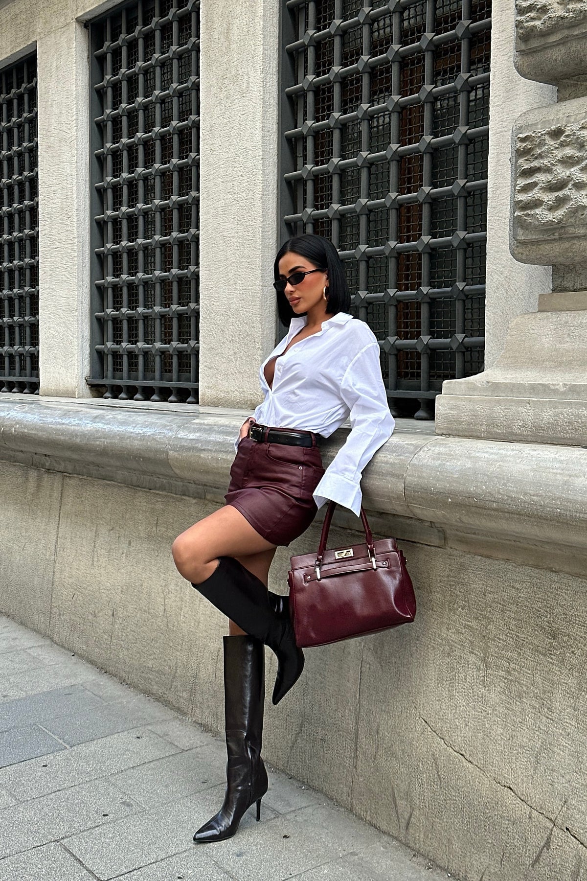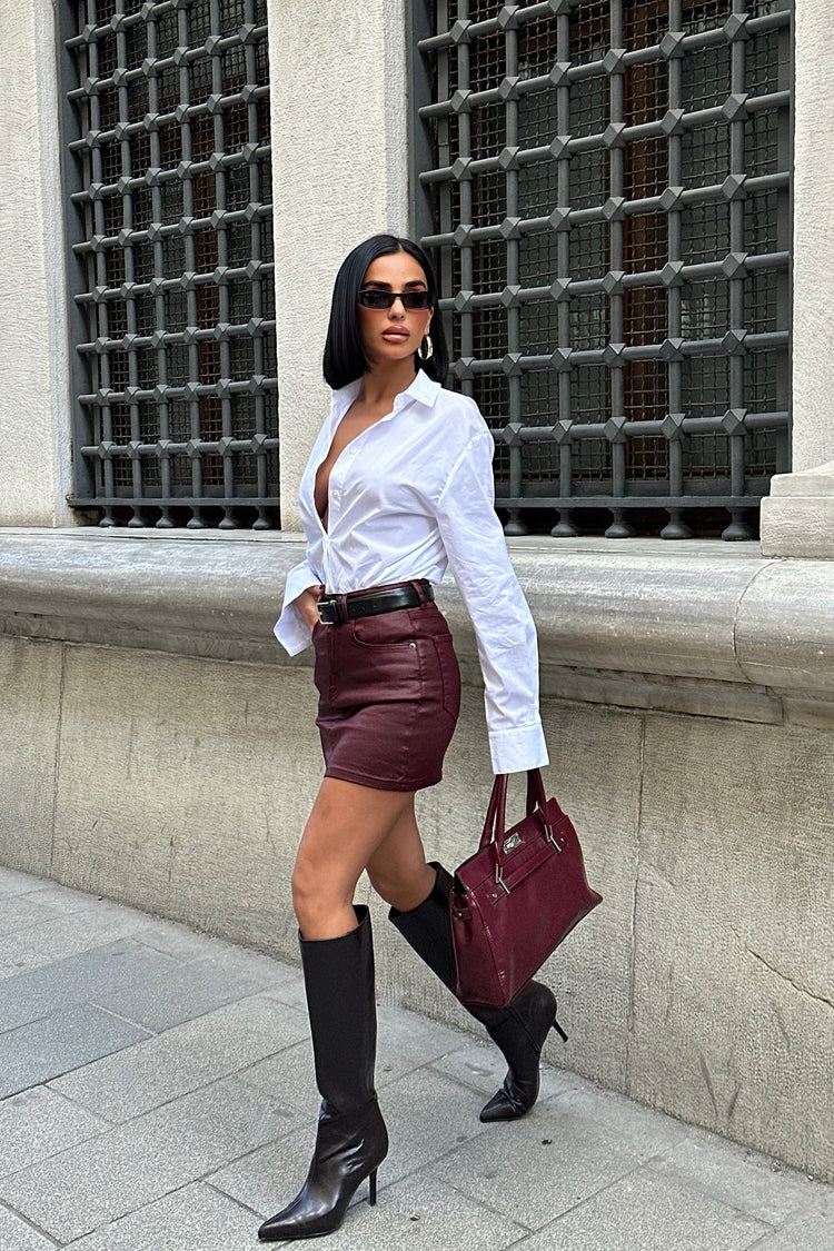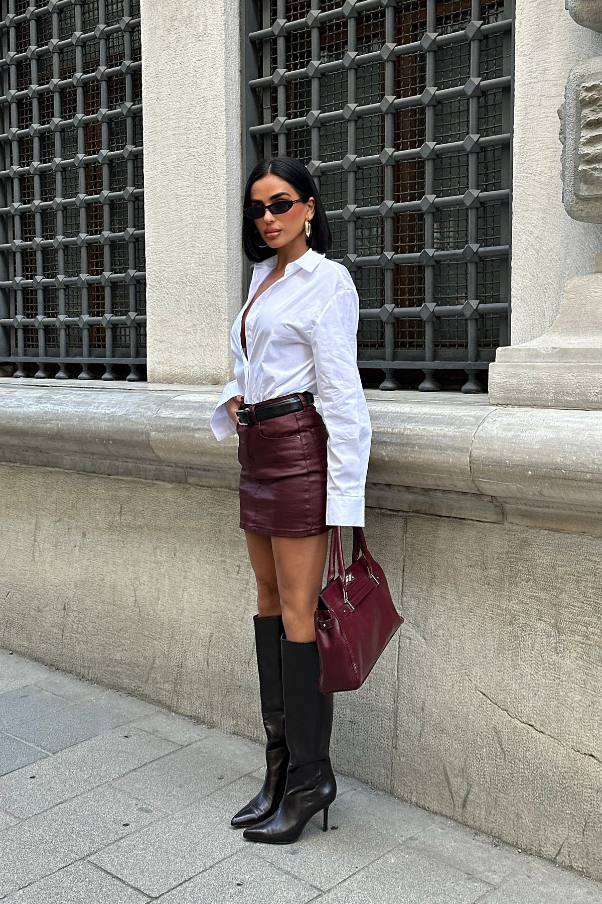 A sculpted mini skirt with a soft waxed texture that catches light like candle glow. Designed in structured 100% cotton with a sleek, body-hugging fit that defines the waist and elongates the leg.