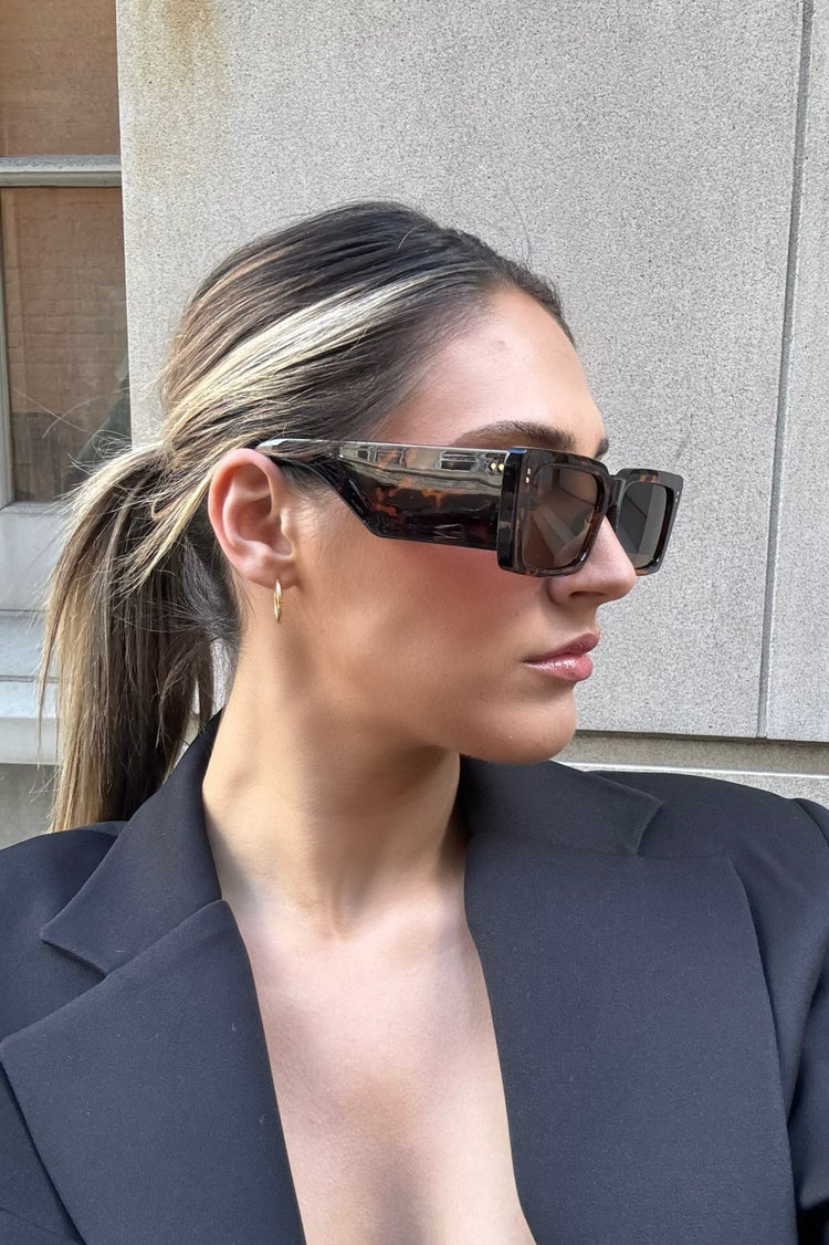 The Bond is a chic classic, rectangular shape with thick black rims. Fitted with fully tinted lens for extra sun protection. Finished with wide arms for added comfort and a superior fit.
